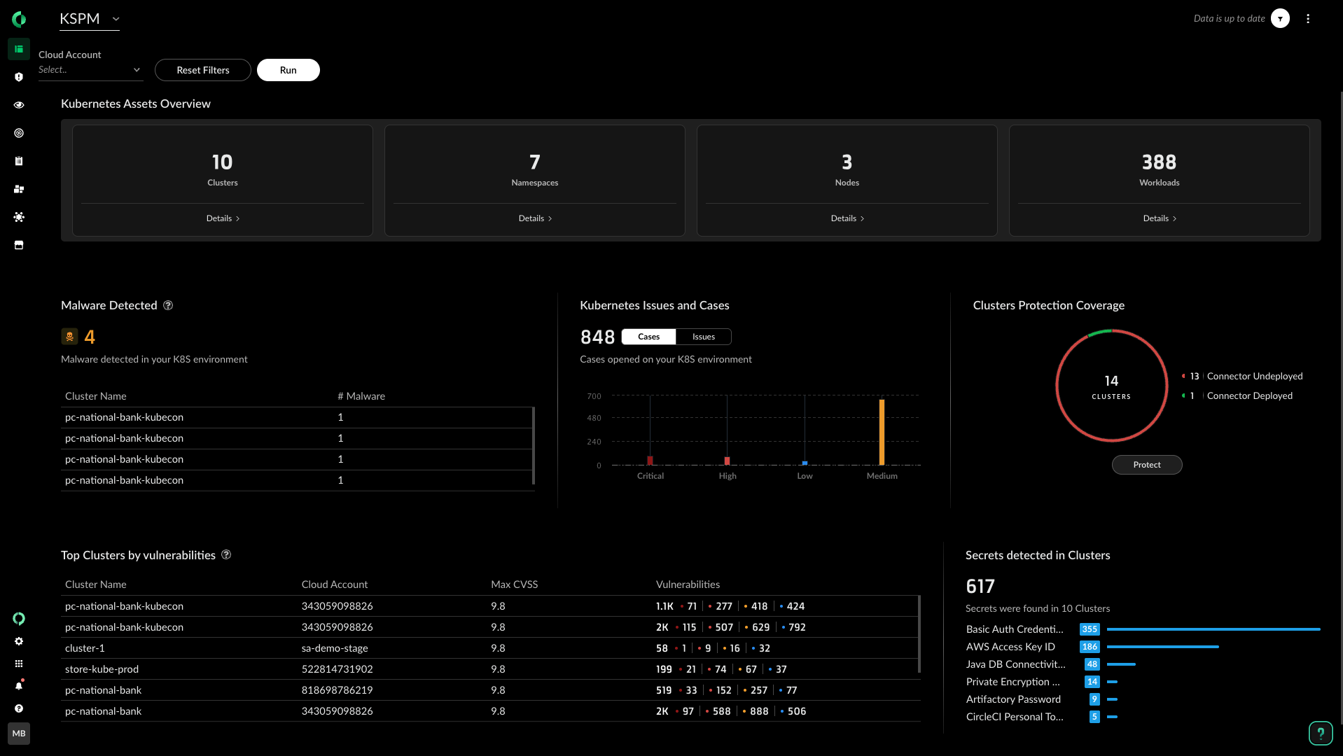 利用導引式修復功能找出並修復 Kubernetes 設定錯誤和安全風險。針對 EKS、AKS 和 GKE Kubernetes 叢集,強化 Kubernetes 狀態並符合 CIS 基準。