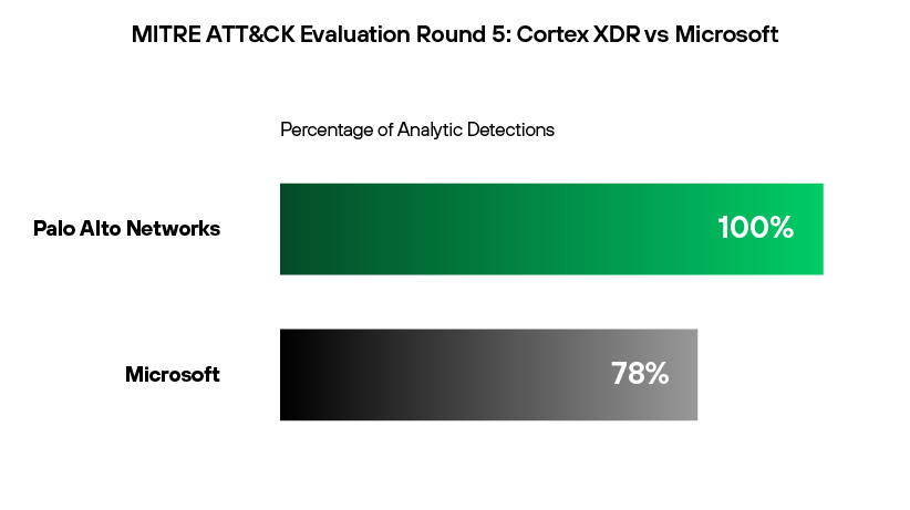 現今威脅行動者穿過企業遭入侵網路的速度仍持續加快中。這樣的行動步調讓企業幾乎沒有時間變更 XDR 解決方案的設定來偵測特定威脅。Cortex XDR 的 100% 偵測率主要歸功於零設定變更,而 Microsoft 78.3% 的偵測率則包含 39 次由設定變更引起的偵測。Cortex XDR 透過以下方式達到這些結果: