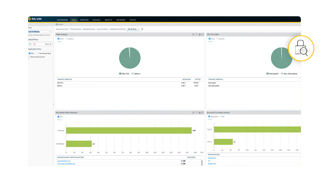 除非進行檢查,否則加密流量會導致企業無法察覺內部隱藏的安全風險。駭客利用這種缺乏可視性的情況在加密流量中傳遞惡意軟體。PAN-OS 為 TLS 和 SSL 加密流量提供全面的解密,包括 TLS 1.3 和 HTTP/2。