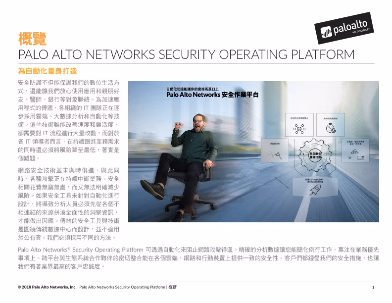 Palo Alto Networks Security Operating Platform 可透過自動化方式來阻止網路攻擊得逞。準確的分析可簡化例行作業,讓您專注於處理業務優先事項。跨平台與生態系統合作夥伴的密切整合能在各個雲端、網路和行動裝置上提供一致的安全性。我們的安全產品憑藉其卓越的表現贏得了客戶的青睞,公司也因此獲得業界最高的忠誠度評分。若要瞭解更多資訊,請下載本概覽文件。